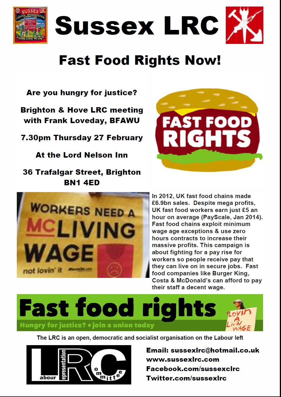Brighton & Hove LRC meets every other month for a friendly discussion around a table in the backroom of the Lord Nelson Inn, which is five minutes walk from Brighton railway station, straight down Trafalgar Street. All welcome at these friendly and informal meetings. Please download the poster above to display or use as a flyer to publicise this meeting. Fast food workers are worth decent pay and conditions.