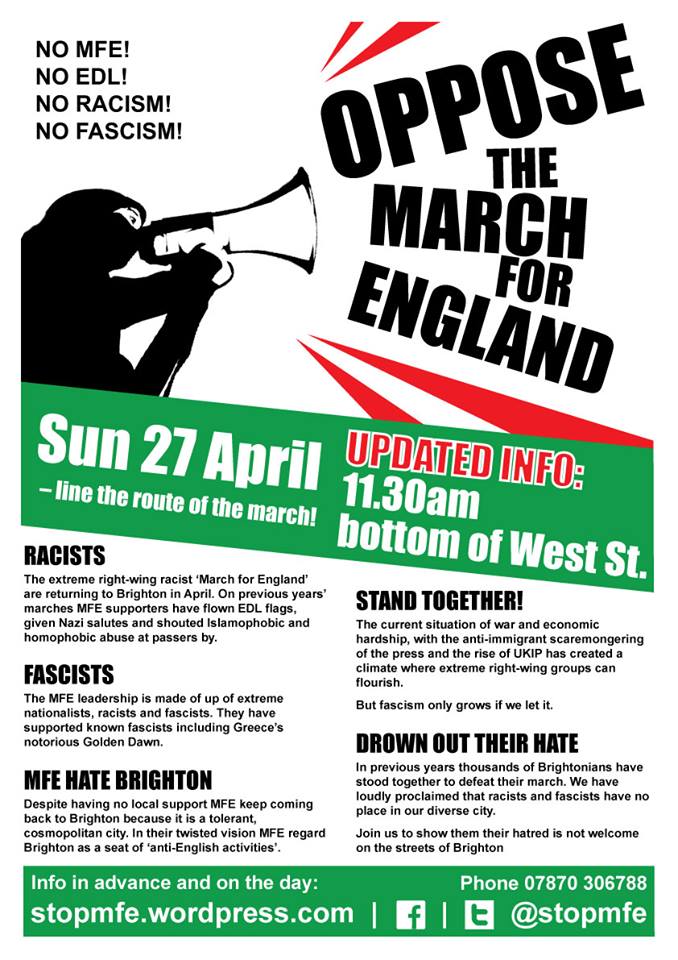 This Sunday residents of Brighton & Hove and anti-racists from across Sussex will come together to oppose the far right’s so-called “March for England”. In all likelihood Brighton & Hove will put on as great a display of unity in rejecting the racists this year, as we did peacefully, loudly and overwhelmingly in our tens of thousands in 2012 and 2013.