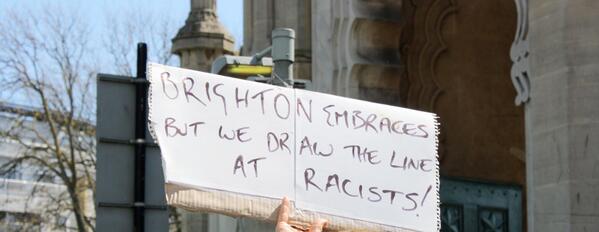 Please join the protest against the racists marching through our towns. Meet from 11.30am on at the bottom of West Street, on Brighton seafront. Ignore any alarmist pieces that, on past experience, will soon appear in The Argus. In 2012 many thousands of protesters witnessed nothing but joyous and peaceful rejection of racism. Indeed the day was by far the most uplifting and empowering occasion that most of us had ever participated in, as the racists were rejected by the people of Brighton & Hove standing united together.