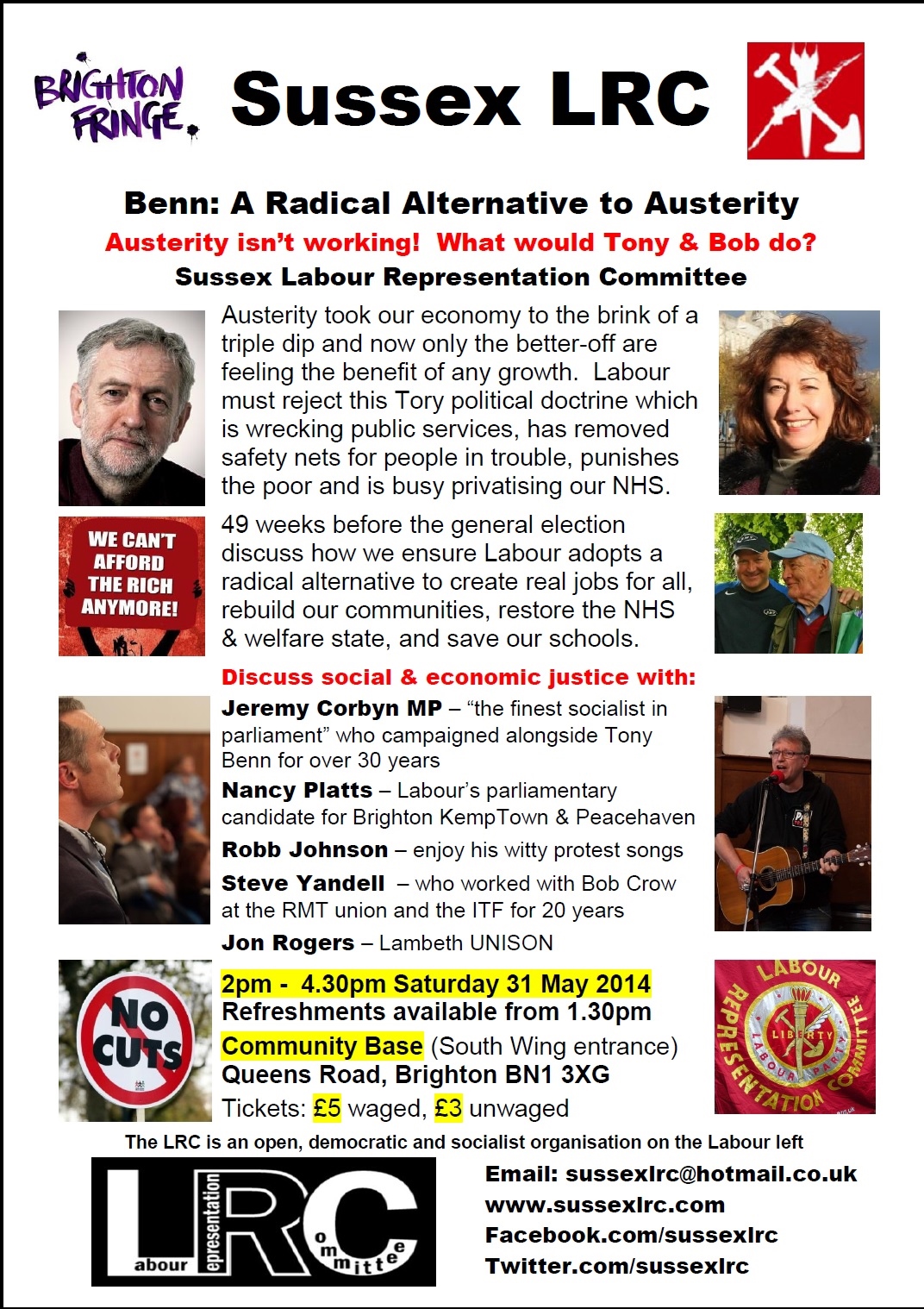 Discuss social and economic justice with “the finest socialist in parliament” Labour MP Jeremy Corbyn, who campaigned alongside Tony Benn for over 30 years, Labour’s parliamentary candidate for Brighton Kemptown and Peacehaven – Nancy Platts, Sussex’s favourite protest singer/songwriter Robb Johnson, Steve Yandell who worked with Bob at RMT and the International Transport Workers Federation for 20 years, and Jon Rogers of Lambeth UNISON. Enjoy a live performance of some of Robb’s witty protest songs, including the brilliant tribute Bob Crow Was A Union Man and celebrate the commitment of socialist legends Tony Benn and Bob Crow.