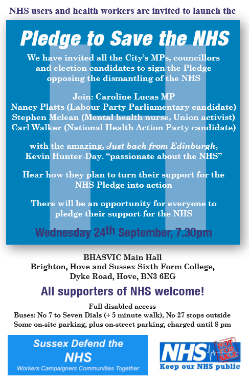 More and more NHS services are being privatised without thought to the impact on wider services. Jobs and services are being cut at East Sussex Healthcare NHS Trust, in West Sussex and all over the country, while Brighton & Hove’s Green-led Council is pushing through privatisation of important community NHS assets. Nationally the Coalition has undermined health workers’ morale with insulting and divisive pay offers, to the extent that NHS staff are to strike over pay for the first time in 32 years, and almost 78% of health workers have no confidence in That Tory Hunt.
