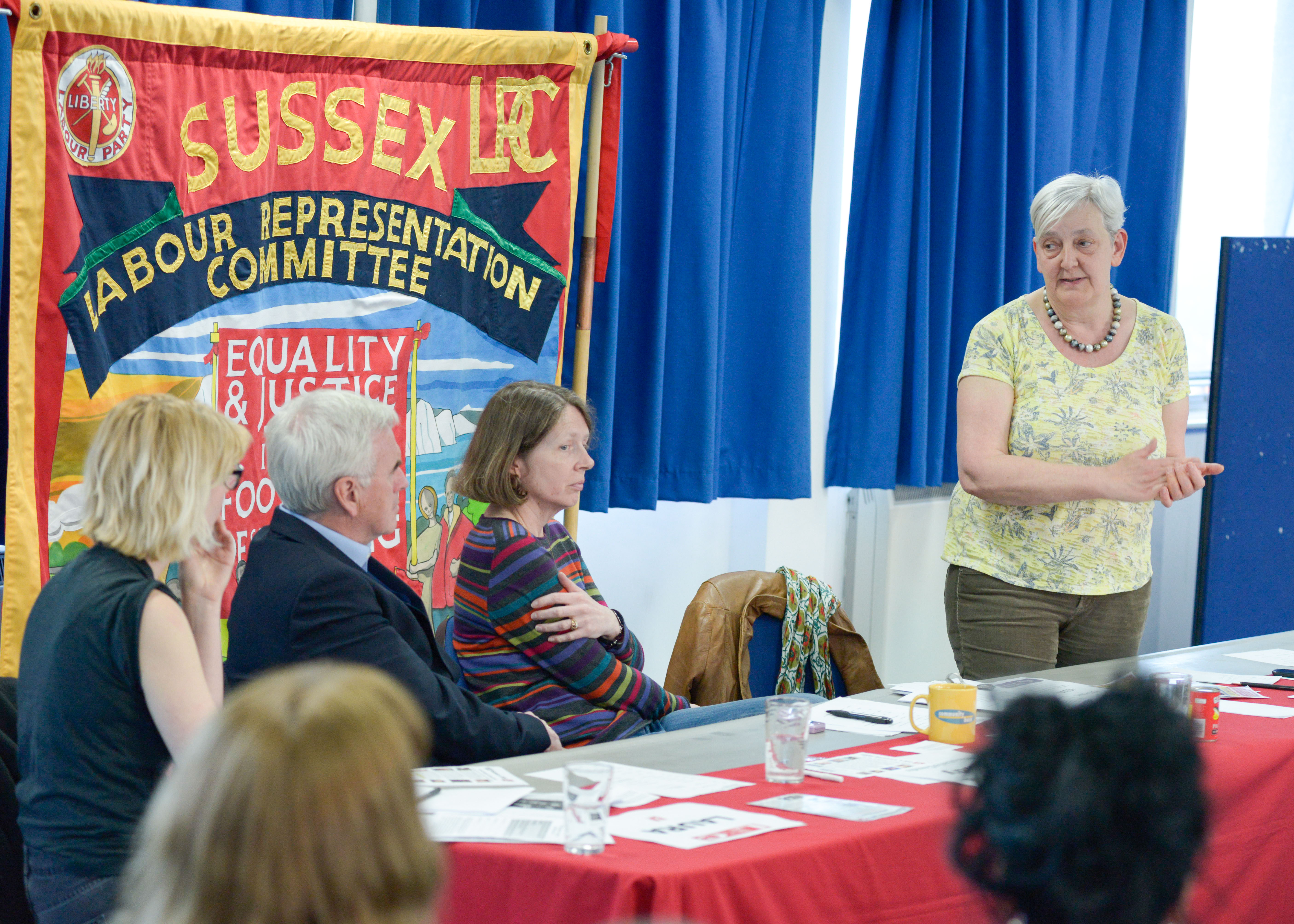 A message of solidarity and support from Michael Meacher MP, Focus E15 housing campaigners and everyone at Sussex LRC’s meeting of 30 May 2015 for PCS representative Candy Udwin (photo copyright Morten Watkins)