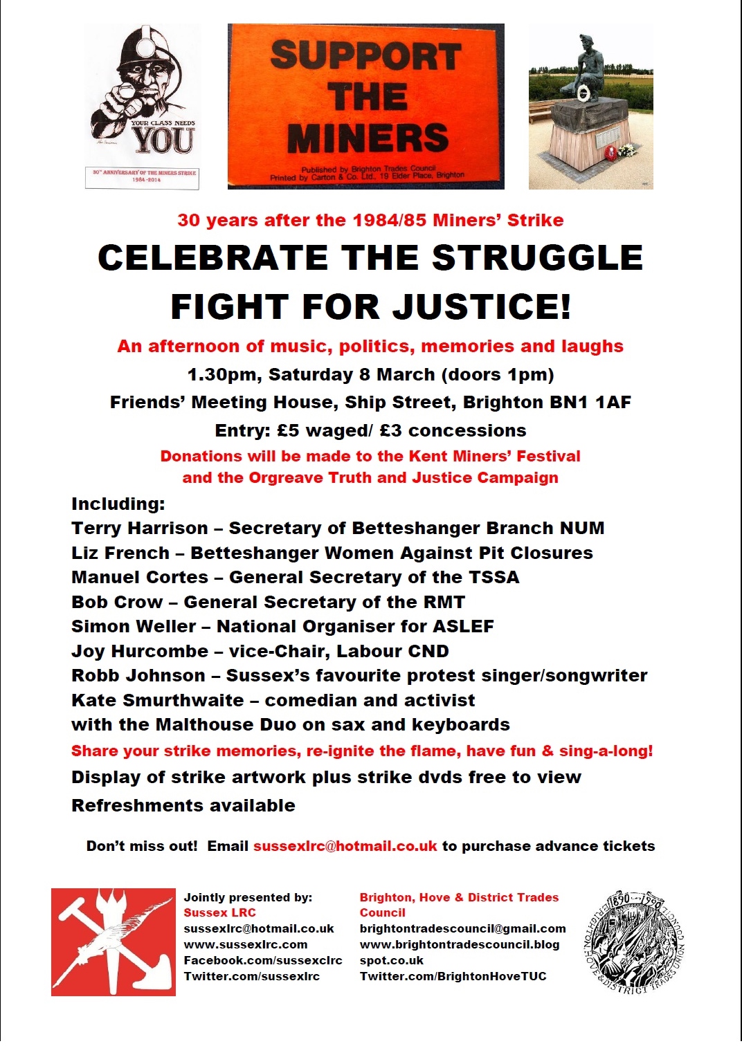 Together with Brighton & Hove District Trades Council, representatives of the Kent miners, Women Against Pit Closures, and some excellent speakers, musicians and comedians, we celebrate the 30th anniversary of the 1984/85 Miners’ Strike and mark International Women’s Day. Sussex LRC’s normal range of tasty refreshments will also be available!