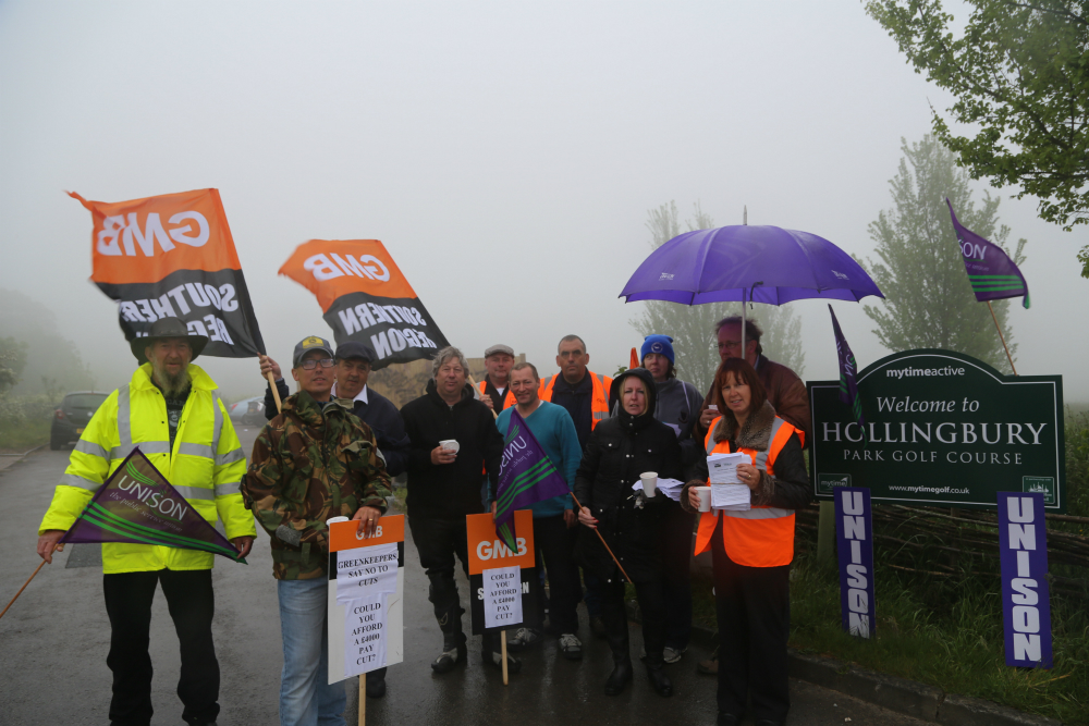 Local greenkeepers took strike action at Hollingbury Park and Waterhall public golf courses on Tuesday 11 June . Consistent, positive support for the picket line came from golfers, dog-walkers, allotment-holders, motorists and passersby, many of whom also wanted to support the Cityclean refuse workers and street sweepers in their dispute. Almost all golfers arriving at the Hollingbury picket turned back, a formal “ladies” match was abandoned in solidarity with the greenkeepers, and one golfer who had started play before the picket began made a point of coming to apologise to the greenkeepers as he left.